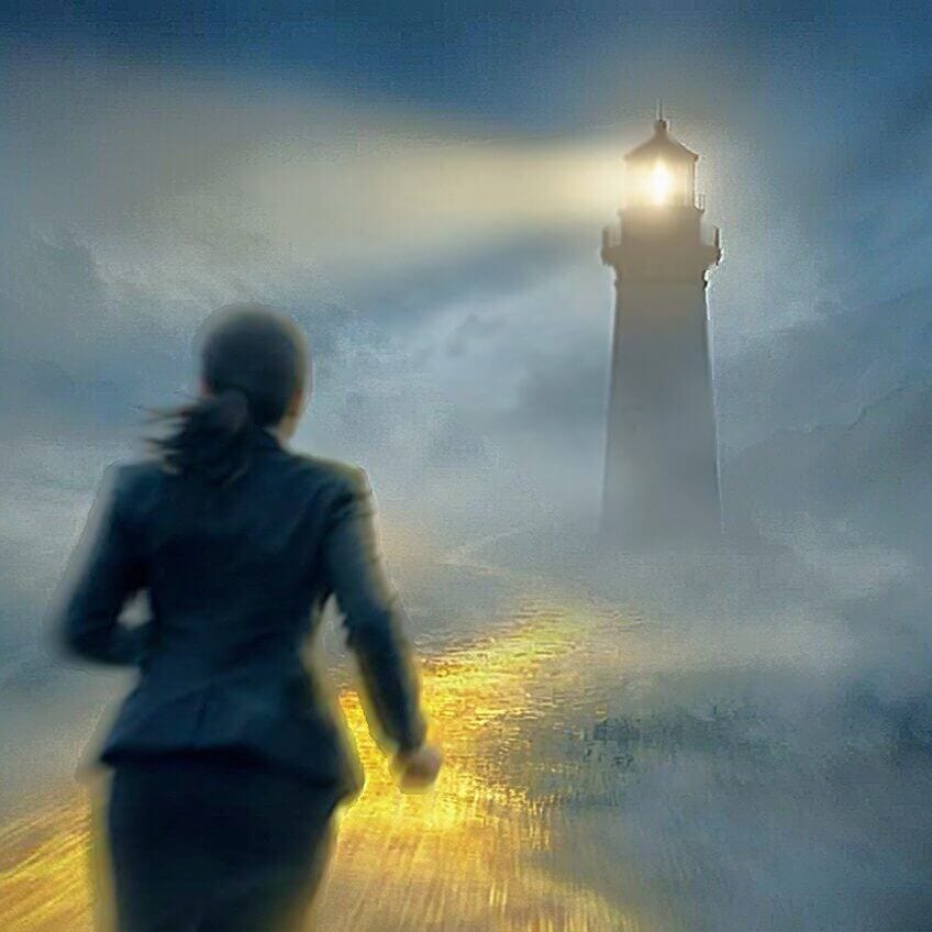 Businesswoman running through fog towards a lighthouse in the distance.