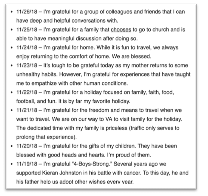 Steve highlighted his November 13 entry: “Today was a frustrating day. I will spare the details. It’s tough to be grateful on days like this. However, I realize that it would also be tough to be grateful without days like this. How do we know “good” if there is no “bad?” I’m grateful for the adversity in my life that makes for a richer and fuller life experience.”