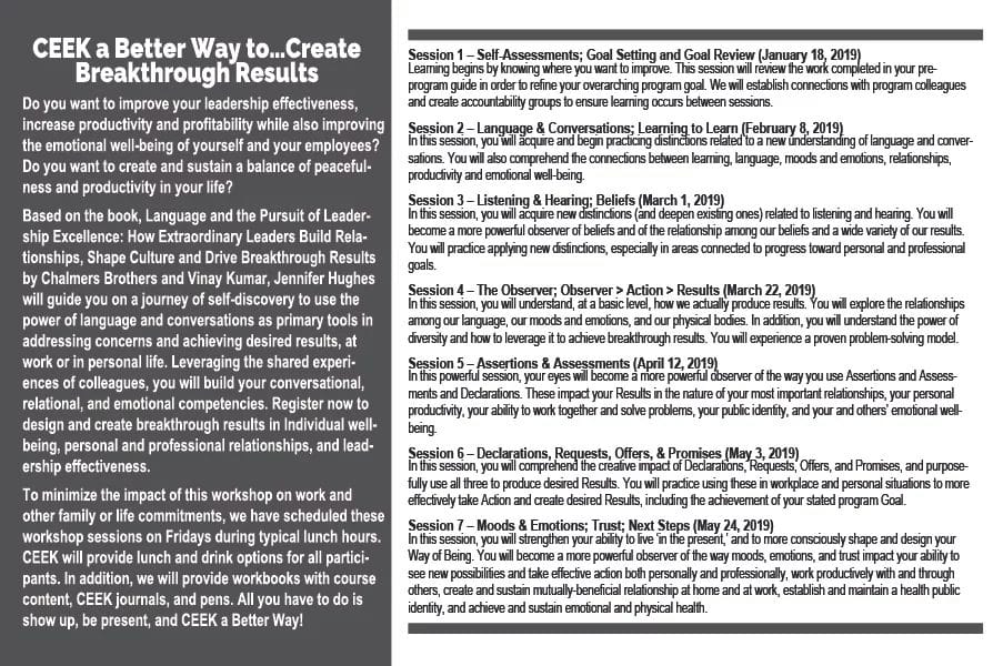 To minimize the impact of this workshop on work and other family or life commitments, we have scheduled these workshop sessions on Fridays during typical lunch hours. CEEK will provide lunch and drink options for all participants. In addition, we will provide workbooks with course content, CEEK journals, and pens. All you have to do is show up, be present, and CEEK a Better Way!